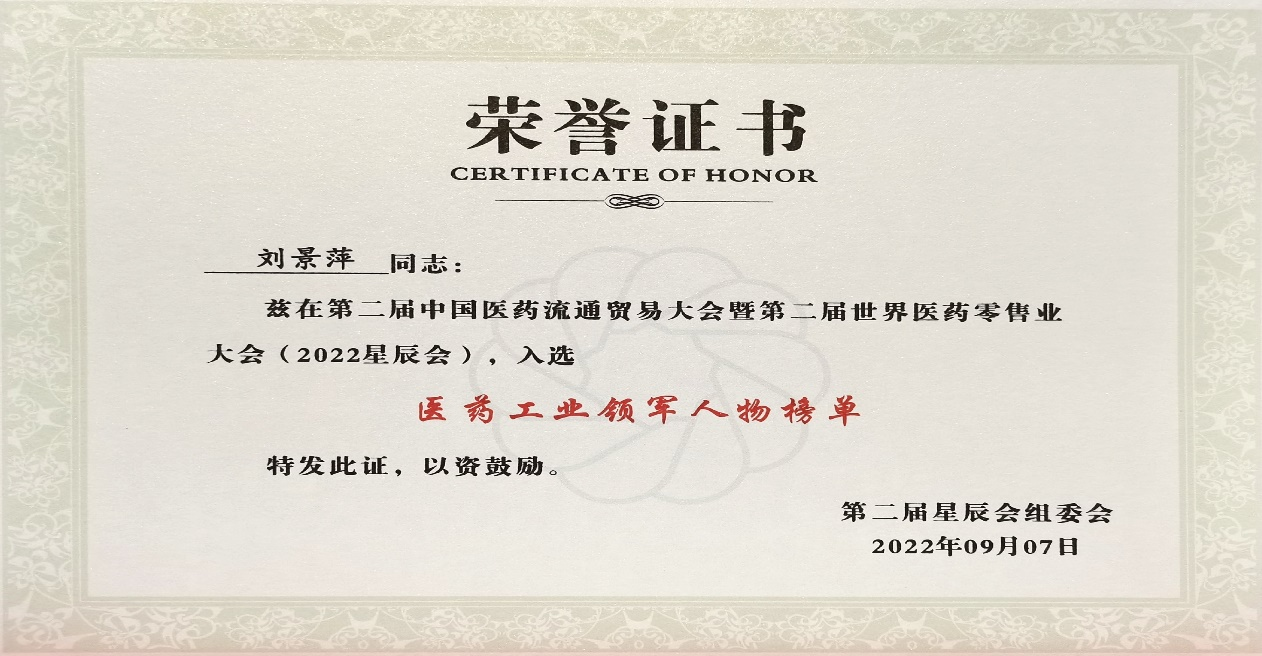 本次星辰会期间,尊龙·Z6斩获颇丰,获得多项行业奖项及荣誉。在开幕式上,刘景萍董事长荣获“医药工业领军人物”称号。